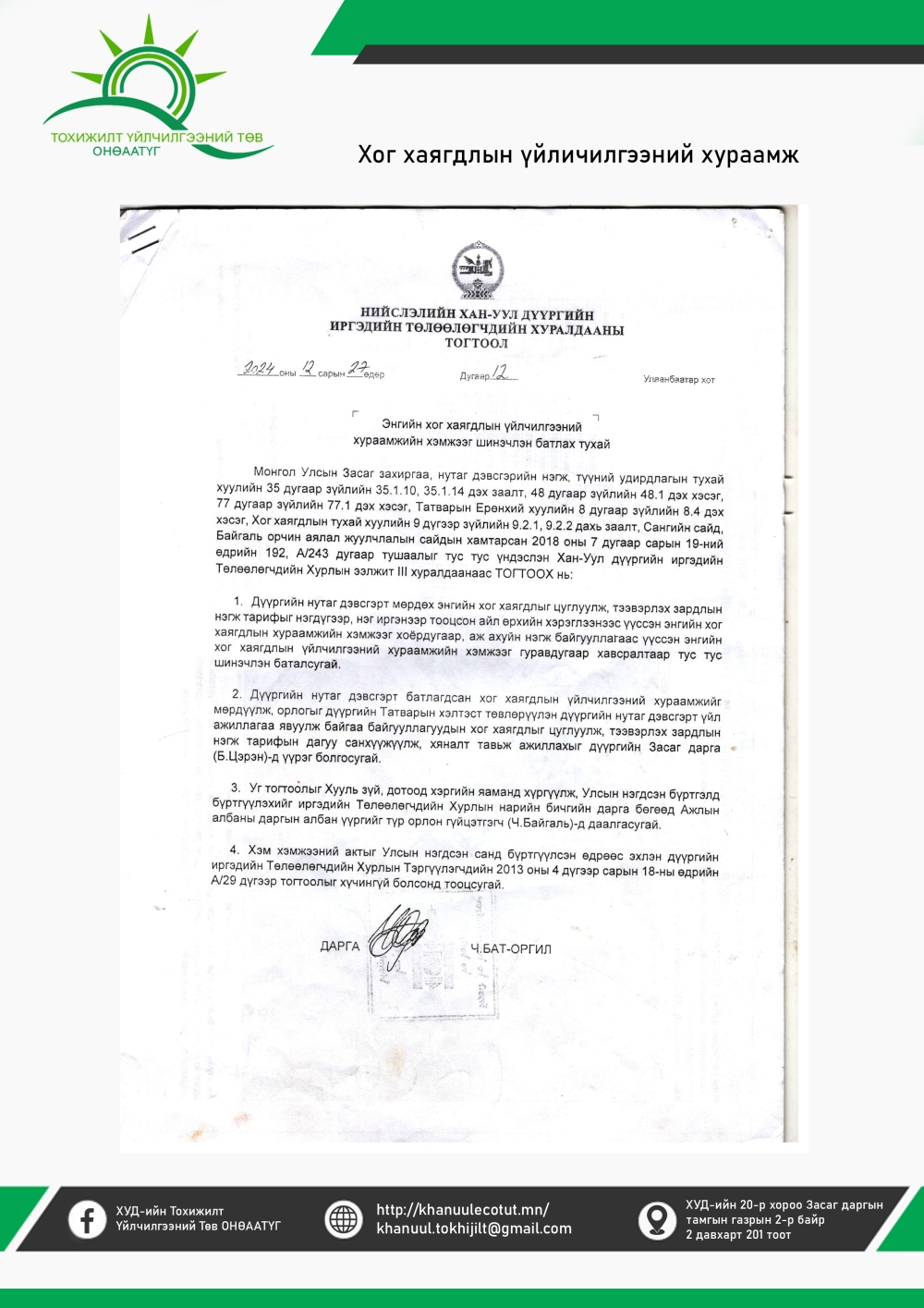 Хан-Уул дүүргийн Иргэдийн төлөөлөгчдийн хурлын тогтоол